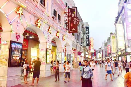 闻名遐迩的上下九商业街位于老城区西关,东起上下九路,西至第十甫西,横贯宝华路、文昌路,全长1237多米,全路段店铺林立、共有商店300多家,日客流量达60万次。荟萃了岭南文化中的岭南建筑文化、岭南饮食文化和岭南民俗风情。