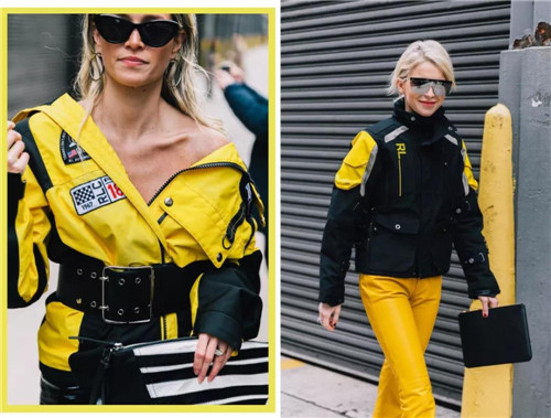 这一季的云雀黄还用到了机车感的服装上,和黑色拼接不仅有很好的提亮效果,还能展现云雀黄帅酷的一面▼
