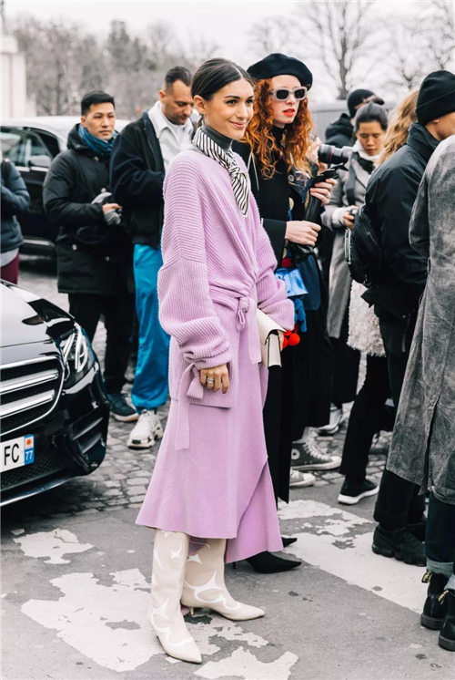 粉紫的针织裙搭配丝巾怎么看都是少女感,强势尖头靴的加入也抵挡不住一身的柔情甜美▼