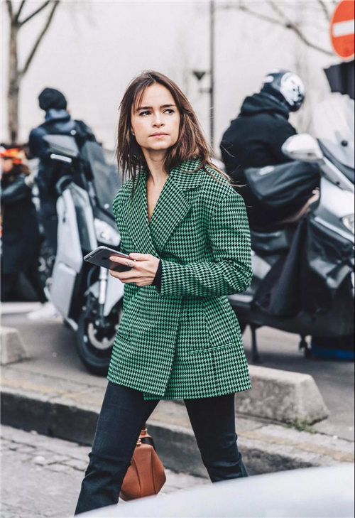 机智的时髦精们并不会将重点全部放在纯色上,带有格纹图案的西装外套也是她们的新宠,这一抹时髦的西装绿可以让整体看起来更有档次▼