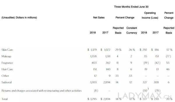 护肤品部门销售额大幅上升29%至13.79亿美元,雅诗兰黛、La Mer和倩碧等品牌均录得双位数增幅,其中La Mer和雅诗兰黛品牌在中国的旅游零售业务增长强劲;