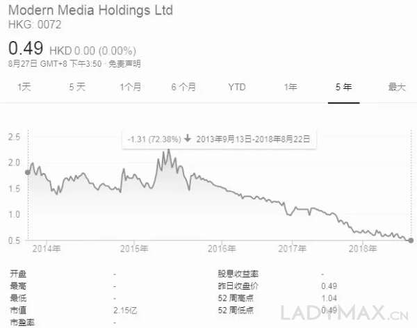 从股价来看,投资者对现代传播的信心持续下滑,截止昨日现代传播(0072.HK)股价报收0.49港元,创下上市以来的最低记录,近5年以来累积下跌超过72%,目前市值约为2.15亿港元。